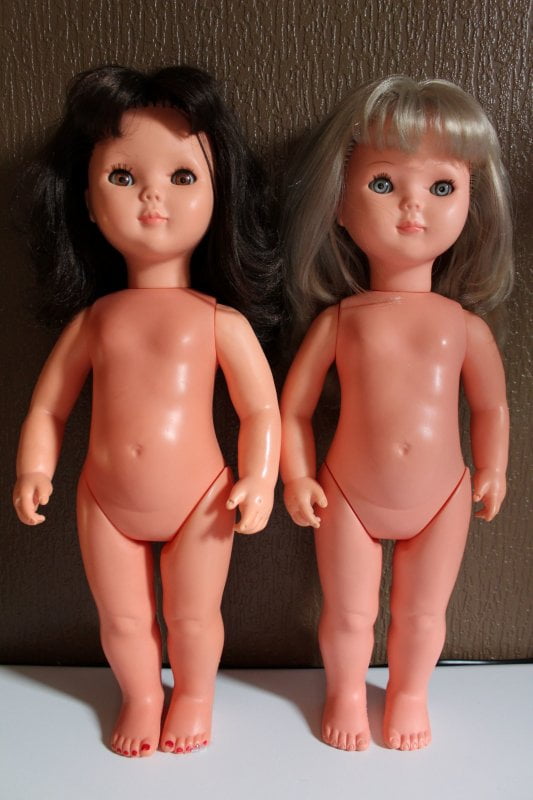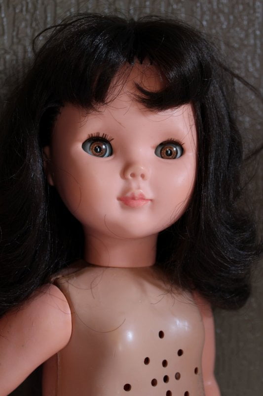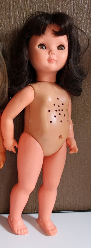 Et maintenant voilà les 2 soeurs côte à côte. Le corps est absolument identique, la tête aussi, si ce n’est la couleur des cheveux et des yeux, qui je le rappelle doivent être bleus pour la blonde et marron pour la brune. Valérie n’a pas non plus de boîte à voix et elle mesure 45 cm. Le vernis sur les ongles n’était d’origine. Je l’ai ôté .